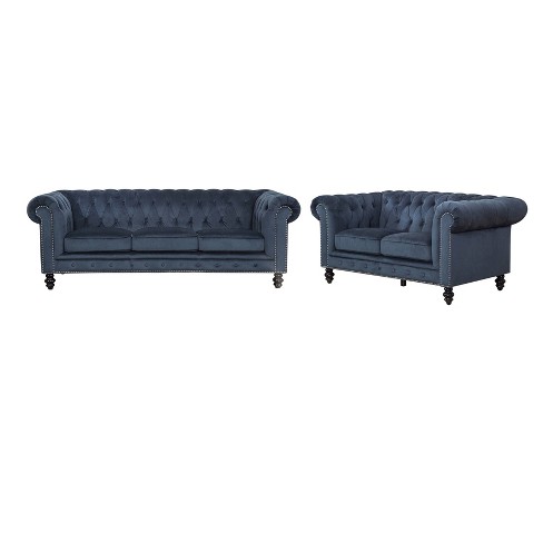 2pc Grand Wyatt Velvet Sofa Loveseat Set Dark Blue Abbyson