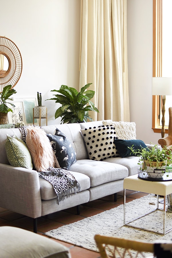 Gray Midcentury Modern Couch With Vintage Moroccan Area Rug Boho