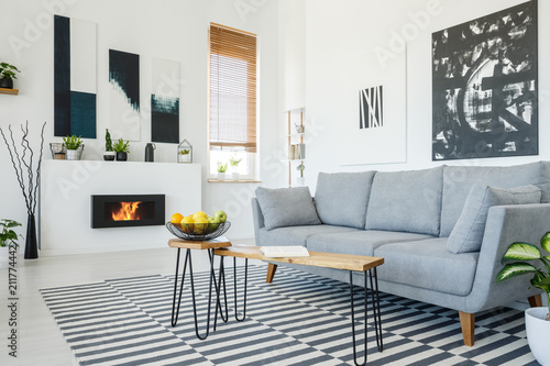 Striped Sofa In Front Of Fireplace In Living Room Of Villa Stock